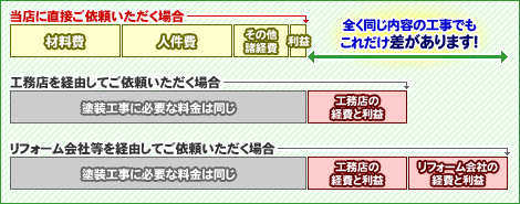 工務店やリフォーム会社等の中間業者を介さず、直接お客様と契約を交わして塗装工事を行いますので、質の高いサービスを低価格でご提供することができます。